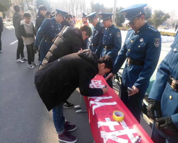 元月初,协调护理系组织士官班15名形象学生,在教学区设立宣传点开展了征兵报名宣传签名活动。活动中,武装部工作人员向同学们细致讲解了今年的征兵条件、报名方法及相关优待政策,武装部通过学校电子屏、悬挂征兵标语条幅、摆放征兵政策宣传展架,以及利用校宣传部、各系部的微信公众号、微博、学生群等平台,推送和宣传征兵政策、报名流程、河南省征兵信息平台二维码等信息。